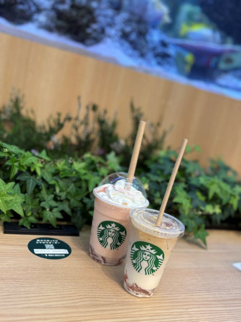 購入したのは期間限定の『白桃と桜わらびもちフラペチーノ(Tall)』『ほうじ茶&クラシックティーラテ桜わらびもち入り(Short)』です。